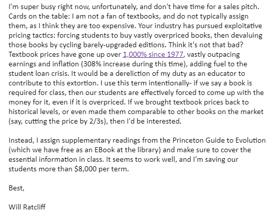 I just got tenure, and dropping the 'don't rock the boat' mentality has taken some getting used to. Anyway, I got an email from a textbook salesperson today, and told them why I don't use textbooks in my classes.