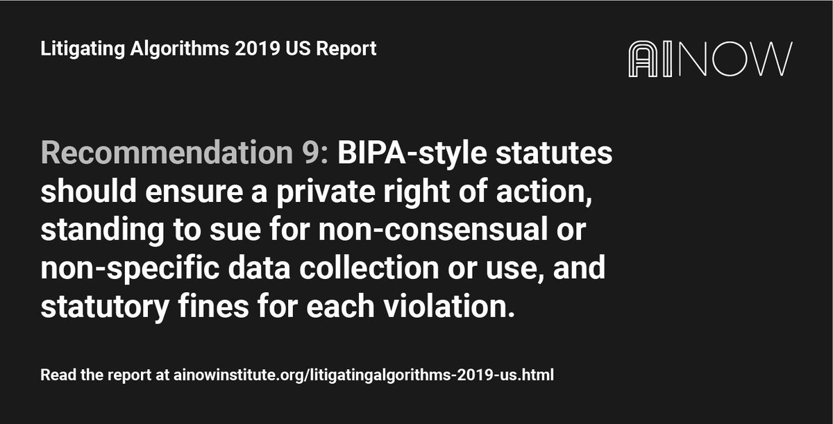 Recommendation 9: BIPA-style statutes should ensure a private right of action, standing to sue for non-consensual or non-specific data collection or use, and statutory fines for each violation.