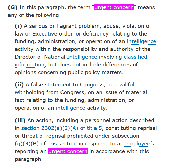 The prior version used the term "urgent concern" twice. The current version uses it 10 times. (term has been around since at least 1998 when the ICWPA was codified). BEFORE THE REPORT WAS RELEASED to Congress the CRS researcher thought this might need more explanation. Odd. 10/