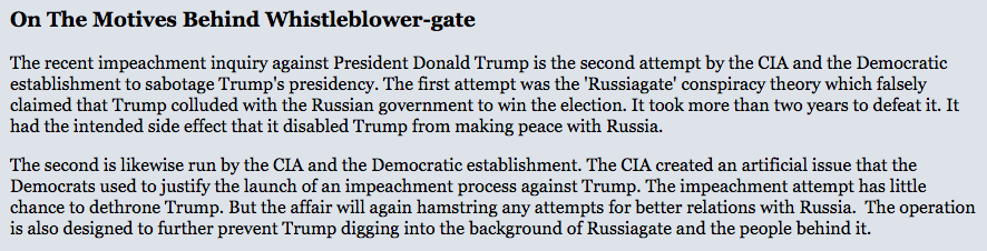 "The impeachment attempt has little chance to dethrone Trump. But the affair will again hamstring any attempts for better relations with Russia. The operation is also designed to further prevent Trump digging into the background of Russiagate and the people behind it."~ @MoonofA