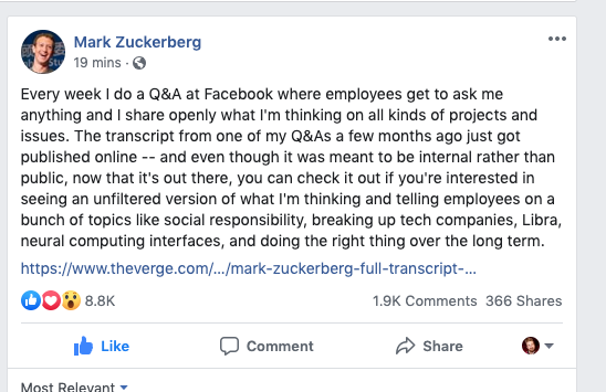 Here are Zuckerberg's thoughts on the leak. To answer some of the conspiracy tweets I've gotten: no, Facebook PR did not give me this audio. I wish! facebook.com/zuck/posts/101…