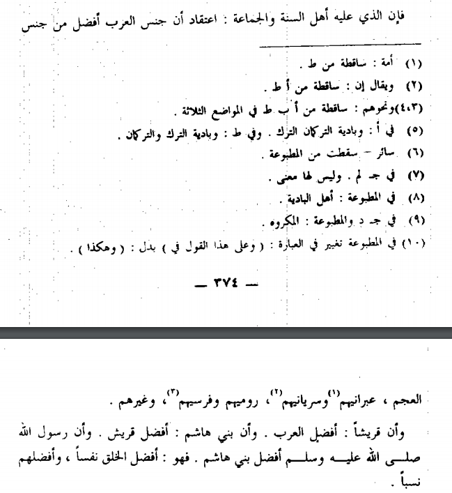 In his Iqtiḍāʾ, Ibn Taymiyyah declared, “Any who would adhere to ahl al-sunnah wa-l-jamāʿah [i.e., be an orthodox Sunni] must believe that the Arab race is superior to the non-Arab races, be they Hebrews, Aramaens, Romans, Persians, etc.”