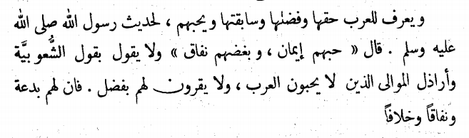"The right of Arabs is recognized as is their supremacy + precedence. They are beloved on account of the ḥadīth of God’s Messenger, ‘Loving them is faith, despising them hypocrisy.’ One does not confess the doctrine Shuʿūbīyah and vile mawālī who do not love the Arabs."
