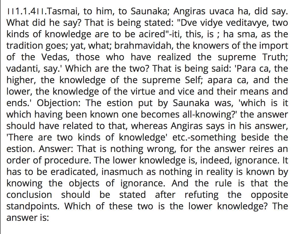 तस्मै स होवाच। द्वे विद्ये वेदितव्ये इति ह स्म यद्ब्रह्मविदो वदन्ति परा चैवापरा च।।1.1.4।।