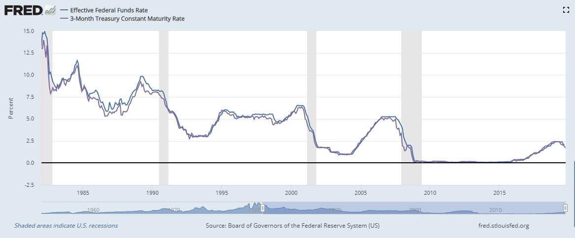 (Note technique : de fin 1982 à fin 2008, la Fed ne donnait qu’un chiffre — le Federal Funds Target Rate — mais depuis, elle fixe une borne inférieure et un borne supérieure — actuellement entre 1.75% et 2%.)