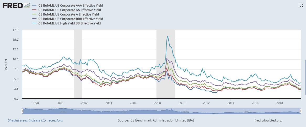 Par exemple, ci-dessous, le taux des obligations émises par le secteur privé aux États-Unis : AAA c’est les plus sûres, puis, par risque croissant, viennent les obligations notées AA, A, BBB et BB (je n’ai pas mis les B pour plus de lisibilité).