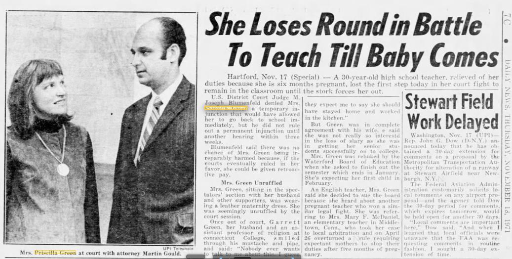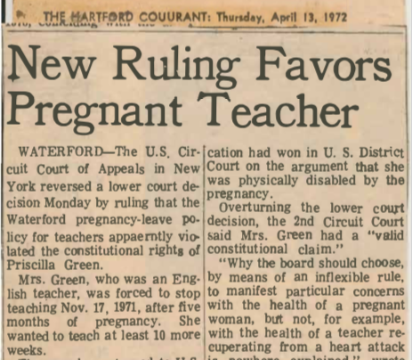 @ewarren The @NEAToday decided to made hers a test case (Green v. Waterford Board of Education) arguing that firing a pregnant teacher — “forced maternity leave” was the euphemism — violated due process + equal protection under the 14th Amendment. It made national news: