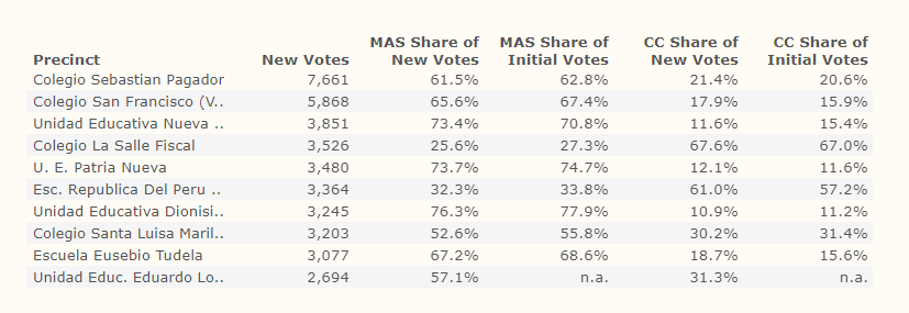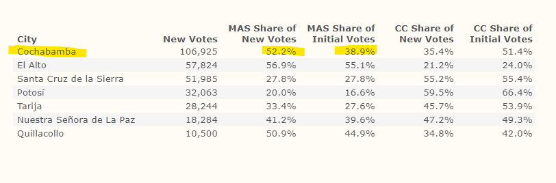 Morales generally has higher support in rural areas, whereas Mesa has higher support in urban areas such as Santa Cruz de la Sierra. This is important to keep in mind. 2/x