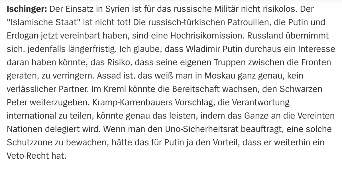 @ischinger hat jetzt Überlegungen zu einem deutschen / UN-Einsatz in Nordsyrien vorgelegt. Im Kern geht es darum, dem militärisch und finanziell überforderten Russland dabei zu helfen, die Region, die es de facto kontrolliert, zu pazifizieren. spiegel.de/politik/deutsc…