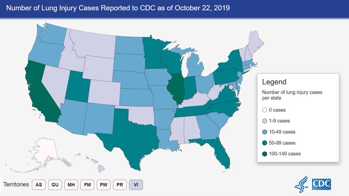 OUTBREAK UPDATE: As of 10/22, a total of 1,604 cases of lung injury associated with use of e-cigarette, or vaping, products were reported from 49 states (all but Alaska), DC, & USVI. 34 deaths were confirmed in 24 states. Get the latest info at cdc.gov/lunginjury Image
