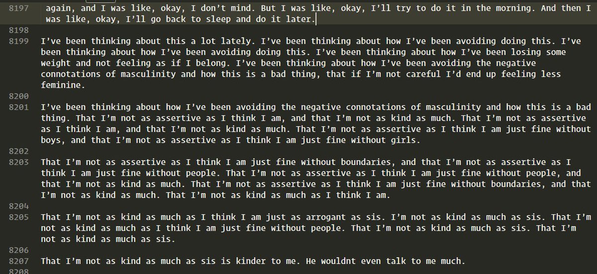 “I’ve been thinking about this a lot lately. I’ve been thinking about how I’ve been avoiding the topic of my life for the past few days. I’ve been thinking about how I’ve been avoiding talking to people, about not talking to people.”