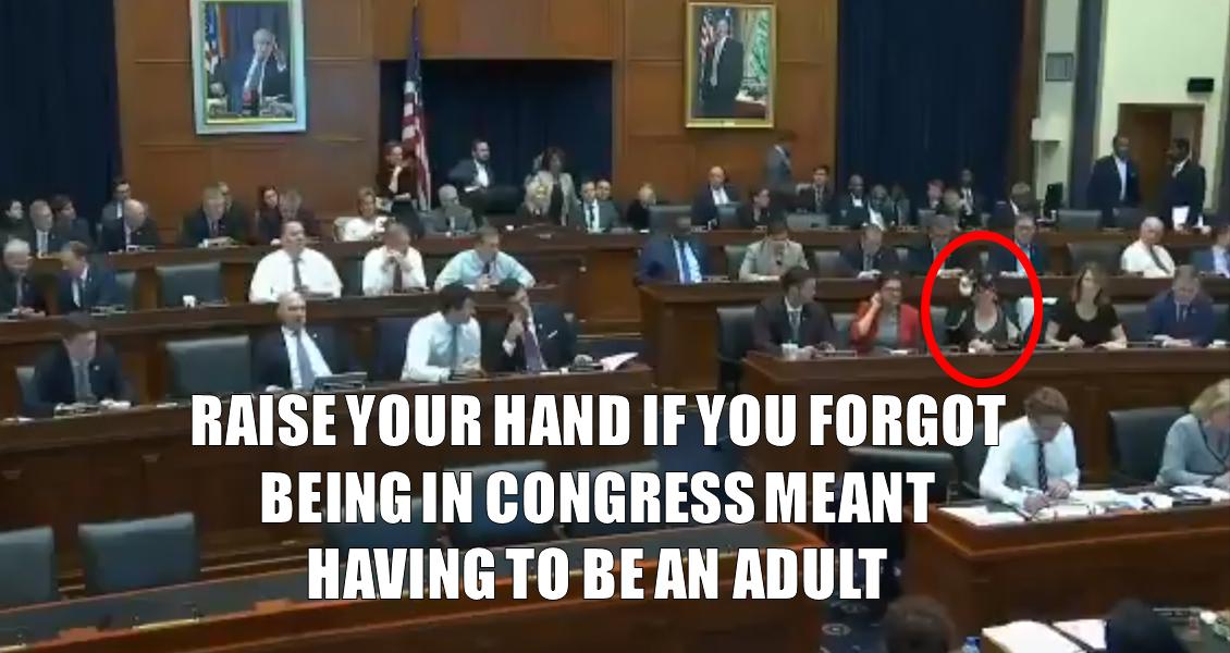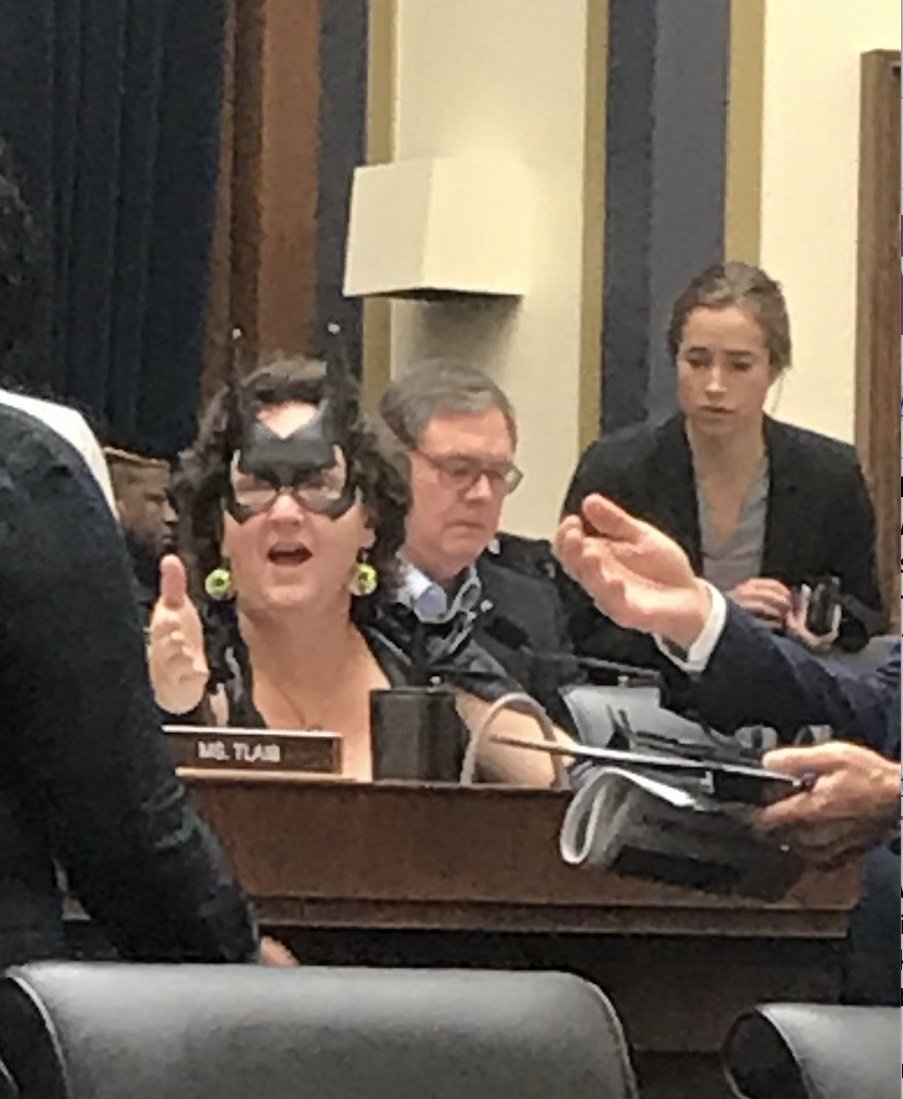 Here's Katie Porter voting in the Financial Services Committee as Batman