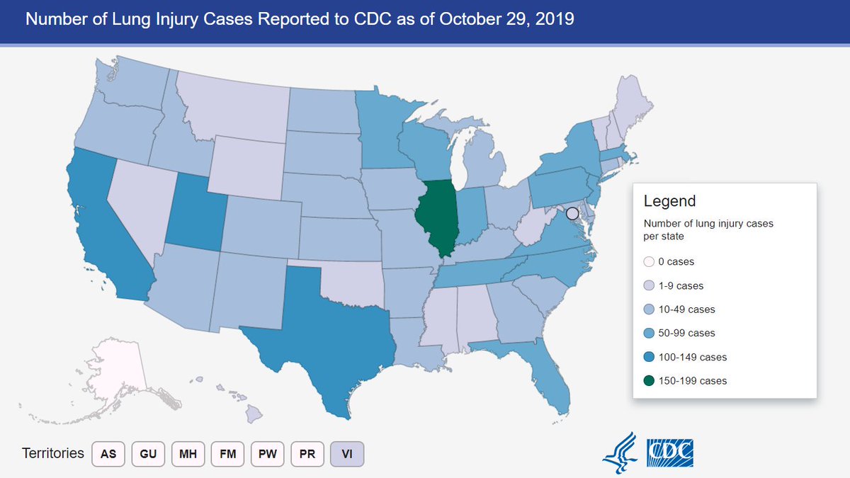 As of 10/29, a total of 1,888 cases of lung injury associated with use of e-cigarette, or vaping, products were reported from 49 states (all but Alaska), DC, & USVI. 37 deaths were confirmed in 24 states. Get the latest info at cdc.gov/lunginjury Image