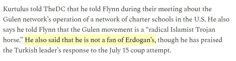 The 10/16/16 article reveals that retired Lt Gen Flynn met with Kurtulus and Hilal Mutlu, the president of a US-based non-profit organization called the Turken Foundation, in October 2016.