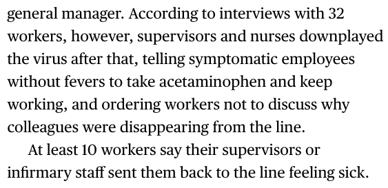 At a meat plant in Pennsylvania, where we interviewed 32 workers, nurses and supervisors sent sick employees right back to work and told them not to talk about their increasingly ill colleagues.