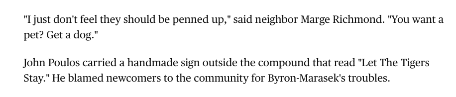 When she lost her legal fight and they were deported to Texas, reporters talked to neighbors. Some were like 'I am very happy the tigers are leaving.' Others--I kid you not--protested the order