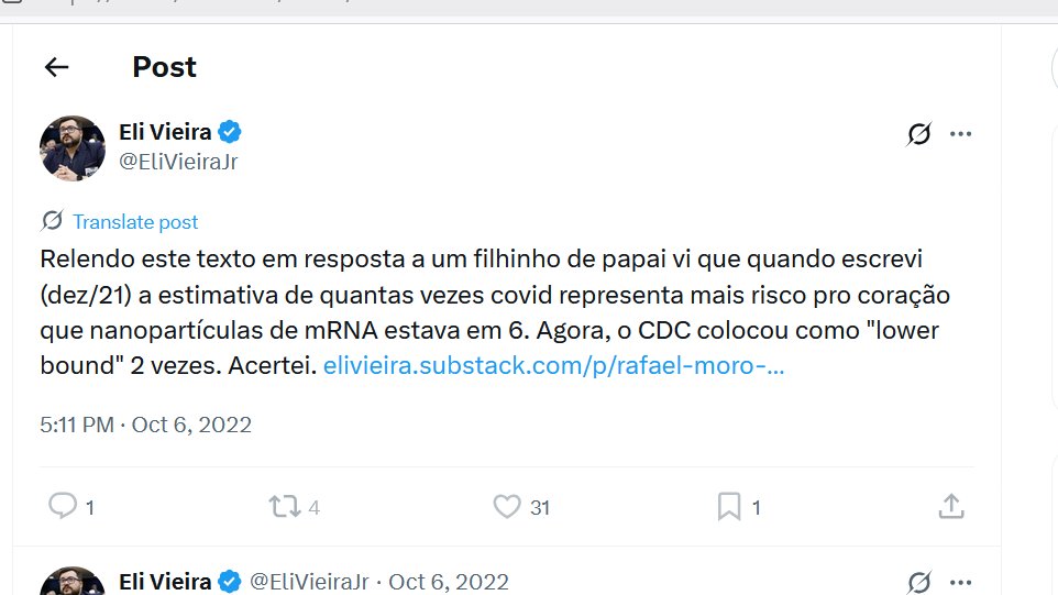 Enquanto isso, o especialista Eli Vieira não via risco nenhum. Ainda assim, curiosamente, ele mesmo não se vacinou. Estranho, né?