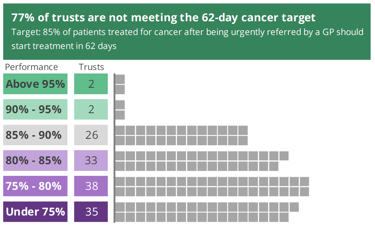 @FDRLST @NHSuk Another target not being met: @NHSuk says that urgent cancer patients should start treatment within 62 days (two months) of a referral. Over three-quarters of NHS trusts aren't meeting this target... 6/ Image