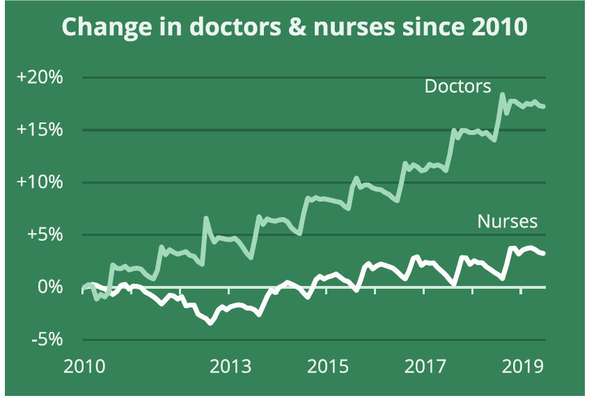 @FDRLST @NHSuk The increase in waiting times comes even as @NHSuk has hired significantly more doctors, and slightly more nurses, over the past decade... 7/ Image