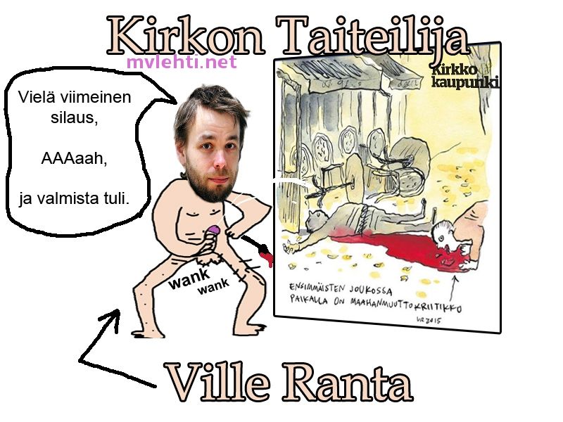 Esimerkillisen selkeää selitysnuolten käyttöä. Wank wank -teksti tuo hyvin ilmi, että kyseessä on masturbointi, eikä taiteilija pitele penistään kädessään muuten vain. Jos olisin Ranta, pyytäisin tästä originaalin seinälleni.
