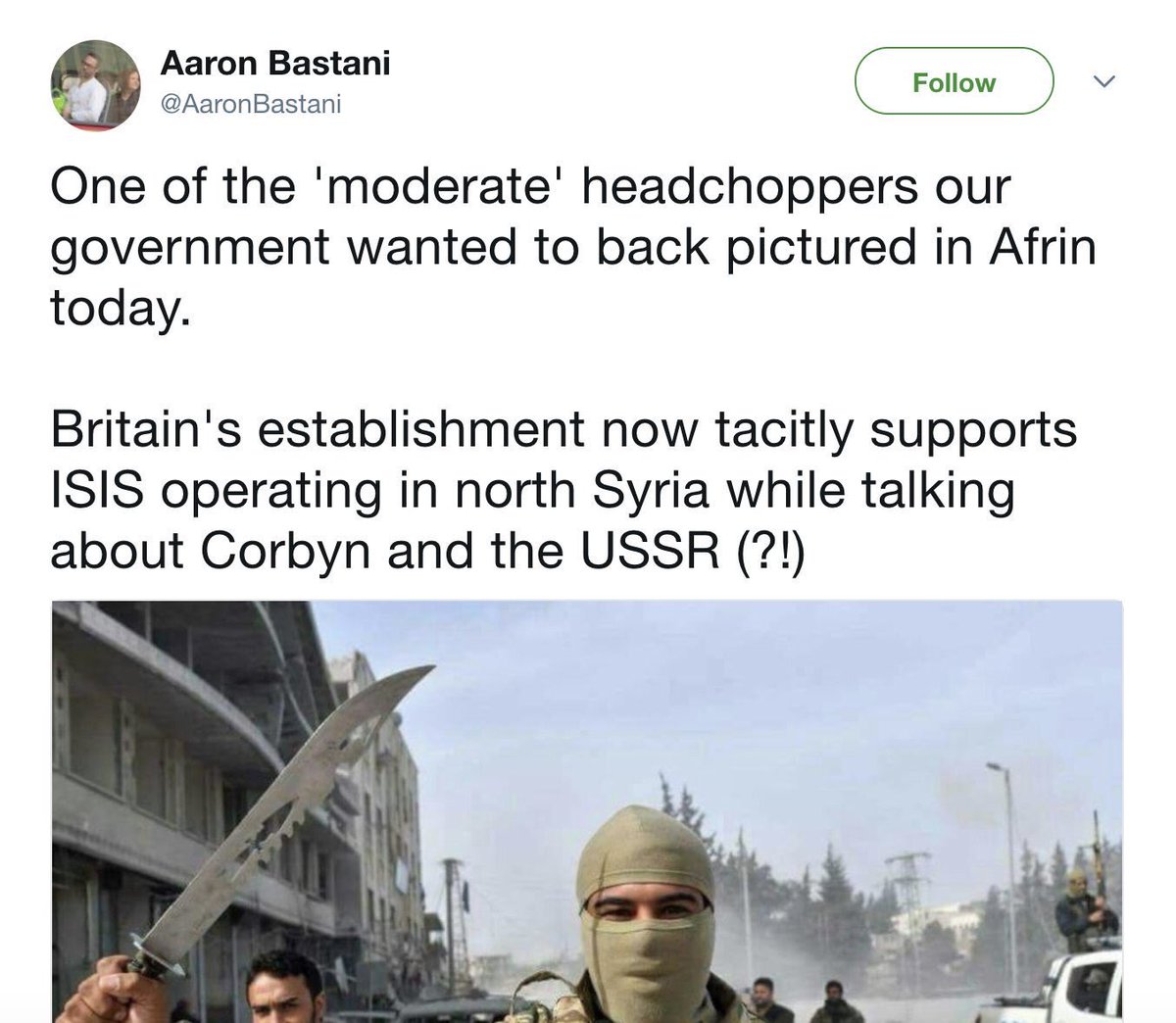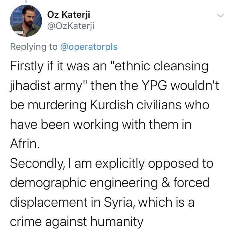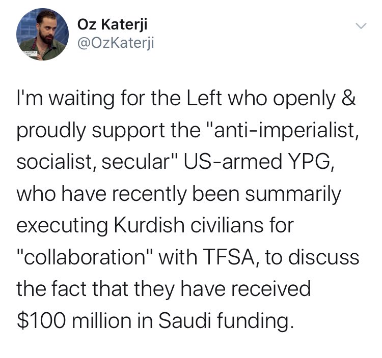 Impressive that even the Daily Mail couldn’t hack employing Oz Katerji, whose main contribution to understanding Turkey’s bloody invasion of Afrin was to defend the honour of the Turkish-backed jihadist/ISIS/FSA gangs who were responsible for war crimes from “anti-Sunni bigotry”