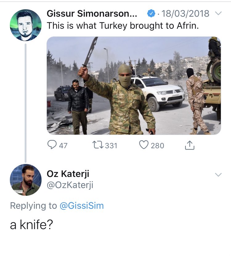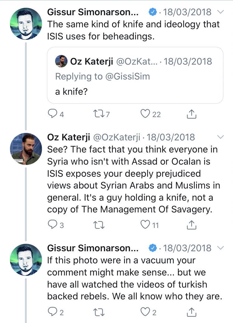 Weird that he regurgitates Turkish attack lines on YPG and in defence of the dignity of jihadist headchoppers (how dare you compare him to ISIS, “it’s a guy holding a knife”)