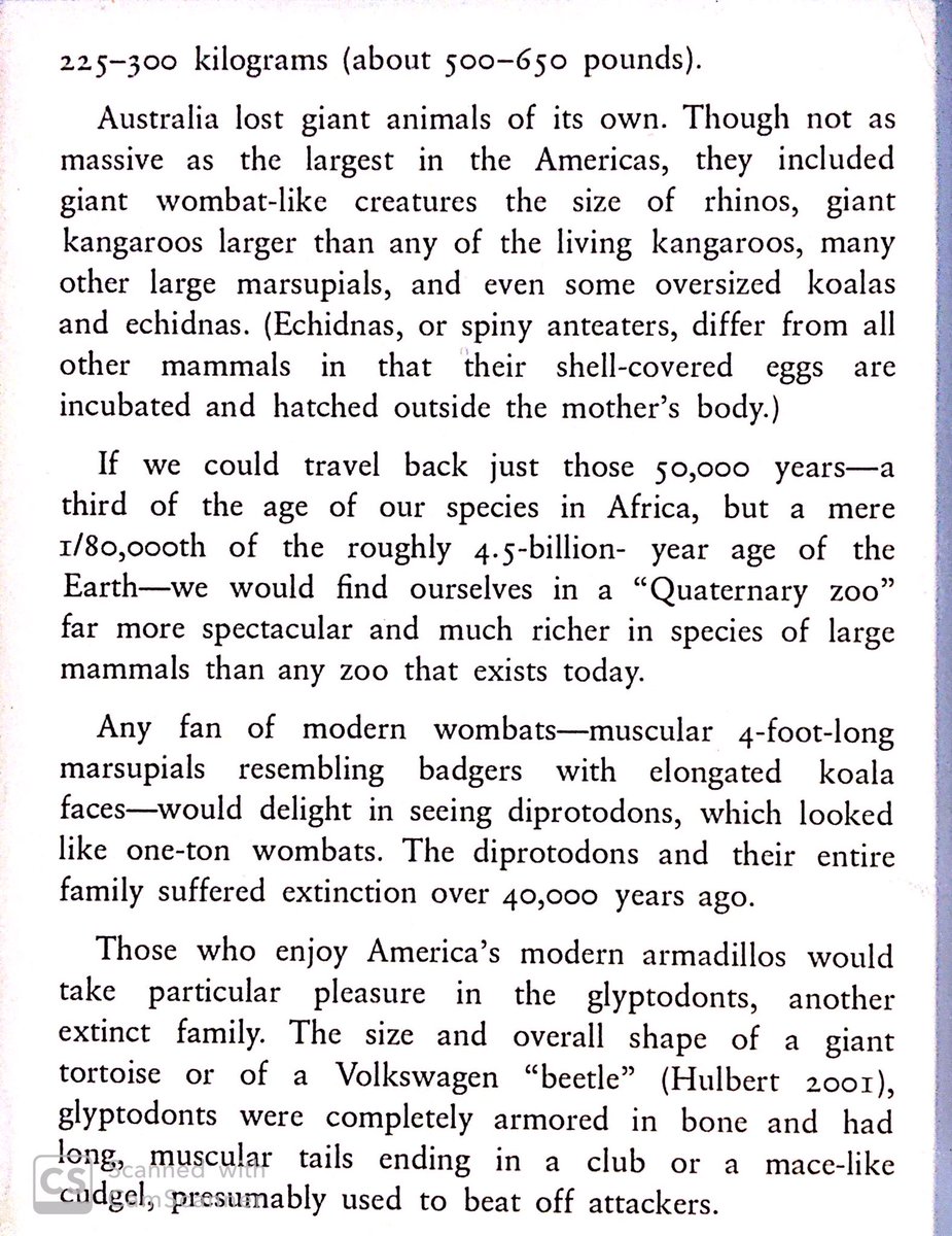 In the last 50k years, half of the 200 genera of mammals over 100 lbs have gone extinct. Amongst them are giant armadillos, dwarf antelopes, giant beavers, American lions, giant ground sloths, dire wolves, sabre-tooth tigers, giant kangaroos & more.