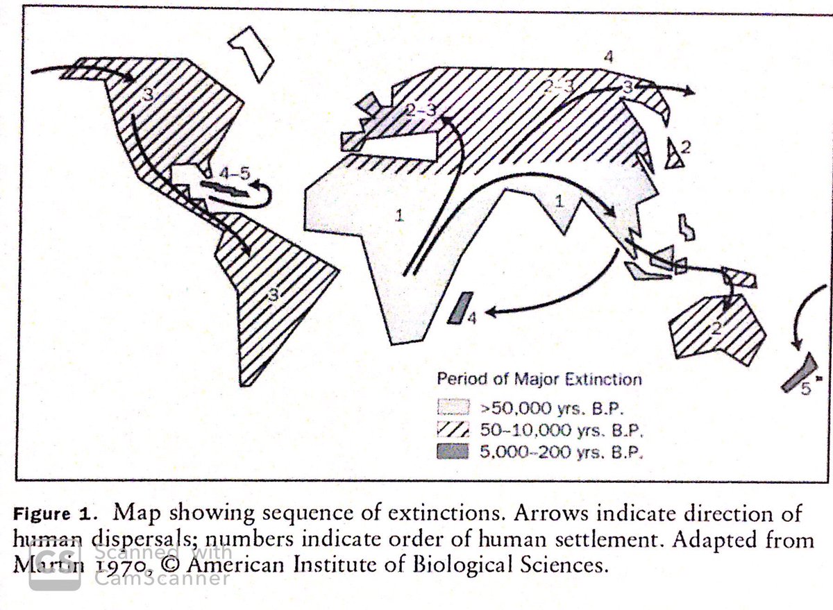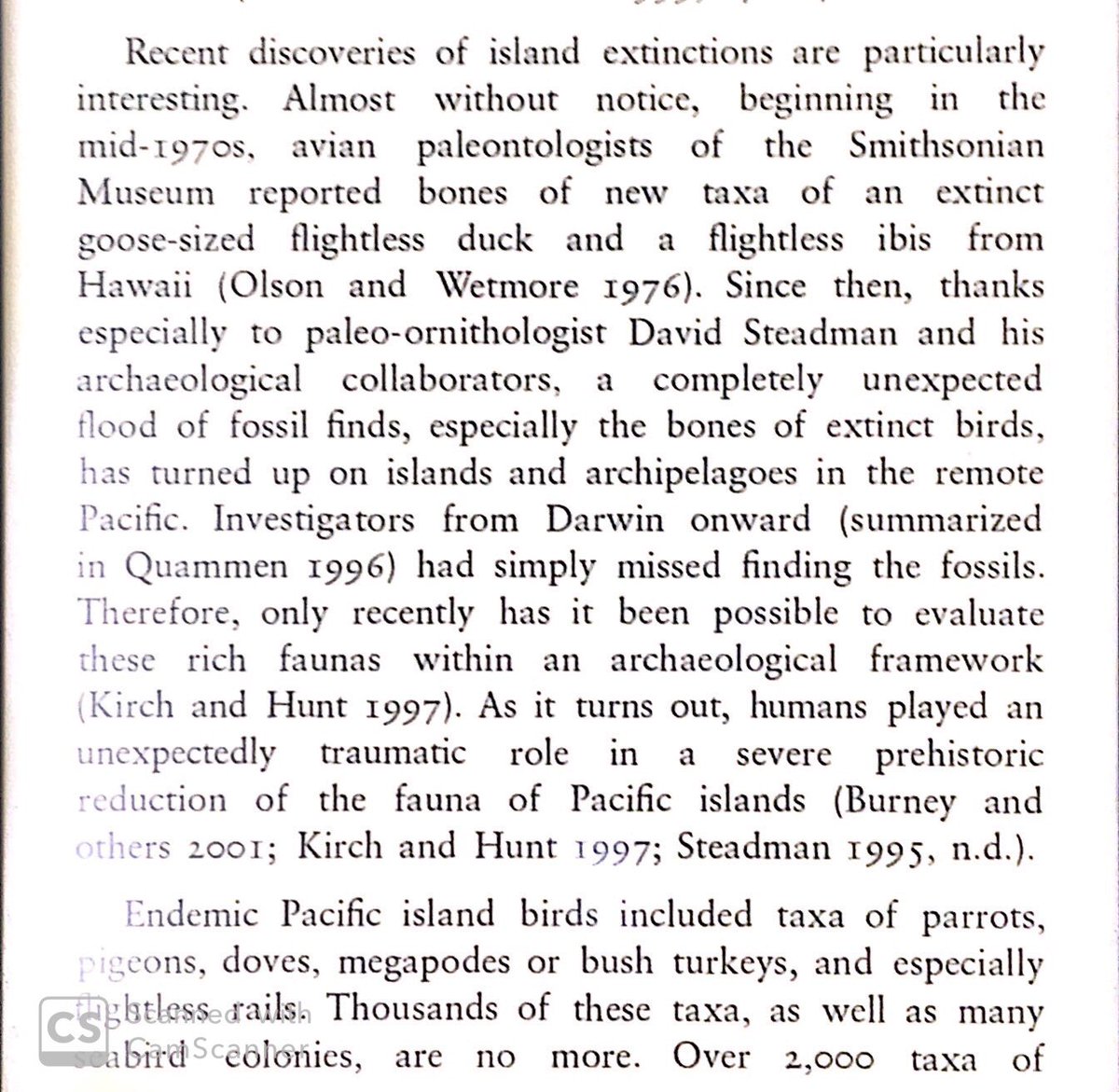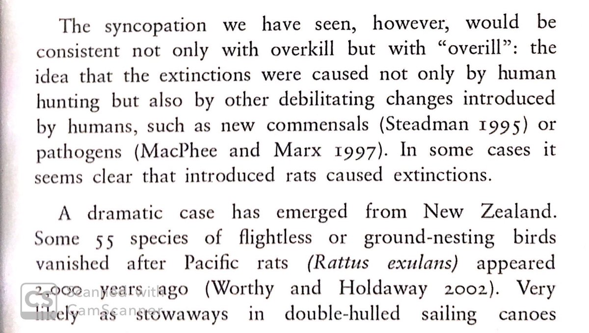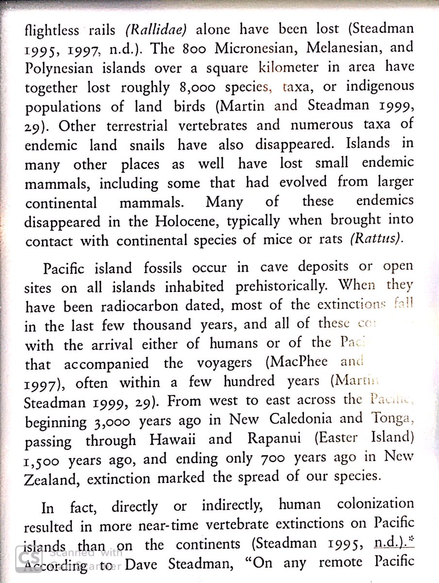 Human colonization of the Pacific led to extinction of 8000 bird species. Partly due to hunting, partly due to rats.