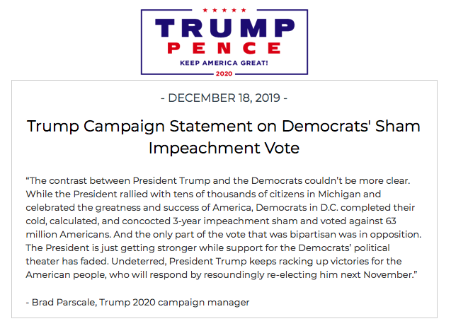 Trump campaign puts out statement on impeachment votes while the president is still on stage in Michigan giving his own response: