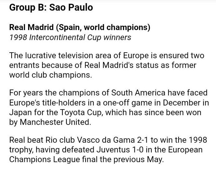 O amigo @mundialraiz lembrou bem: alguém lembra por que o Real Madrid disputou a primeira edição do Mundial da FIFA, em 2000? Campeão Mundial pela Copa Intercontinental em 98. O campeão de 99, Man Utd, ocupou a vaga de campeão europeu. 🤷🏻♂️ https://t.co/yDkpim4xHCnews.bbc.co.uk/1/hi/special_r…