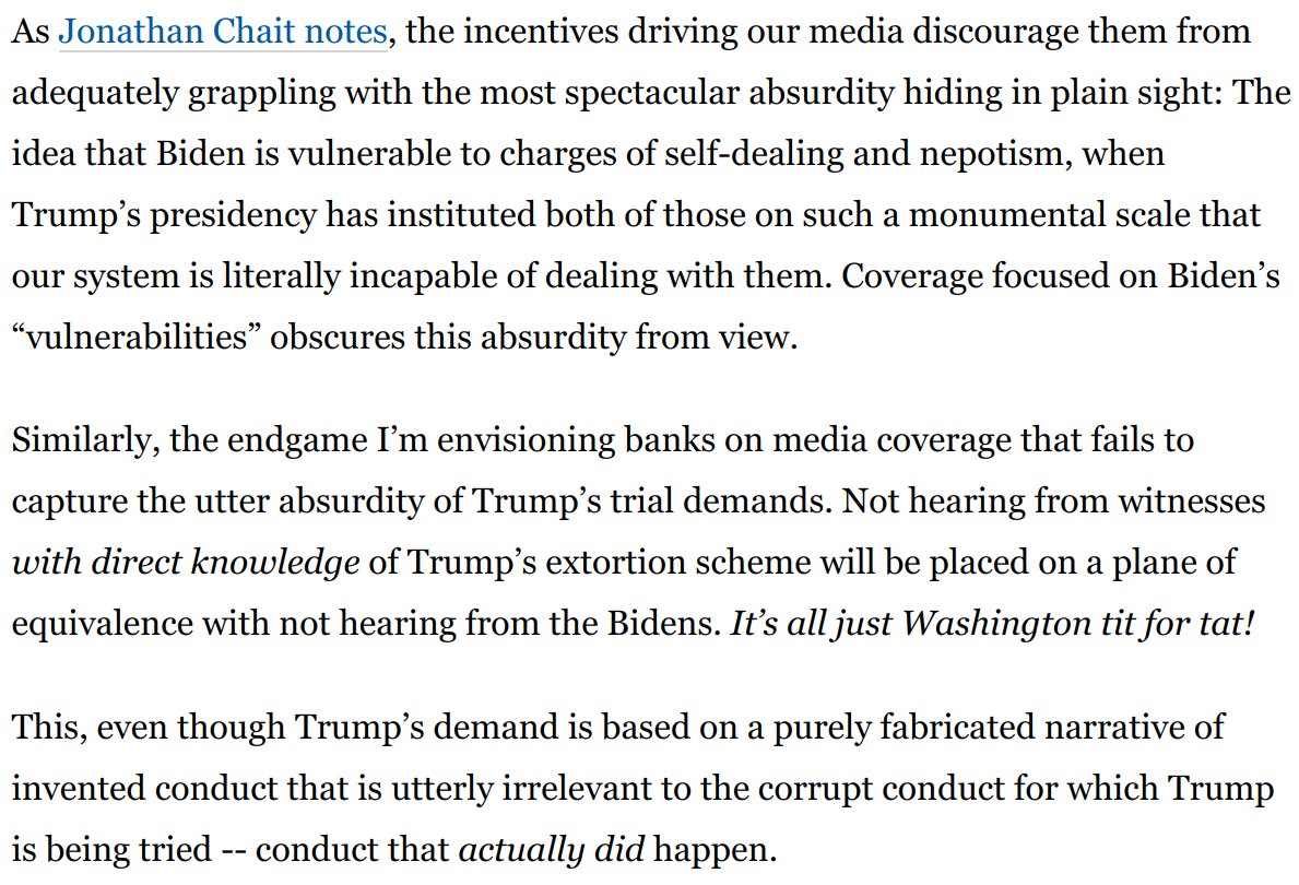 Not hearing from witnesses with direct knowledge of Trump’s corrupt extortion scheme will be placed on a plane of equivalence with not hearing from the Bidens.