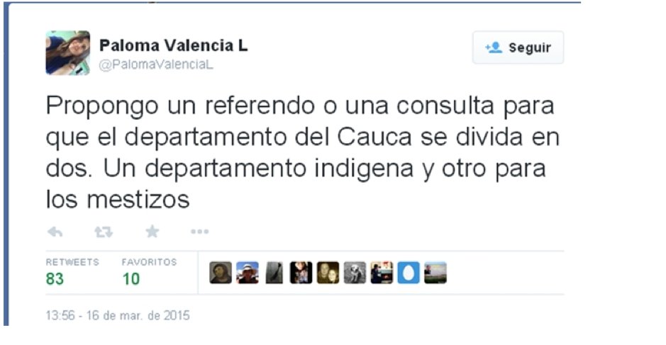 Paloma Valencia, senator and personal friend of ex-president Uribe, suggested in 2015 to divide the Cauca into one department for indigenous people and another one for mestizos (2)
