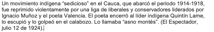 Quintin Lame would not forget. In his book Los pensamientos, Lame writes: “if the pen of Guillermo Valencia serves to write 'Anarkos', the pen of the Indio Manuel Quintín Lame serves to defend Colombia” (8) siise.bibliotecanacional.gov.co/BBCC/Documents…
