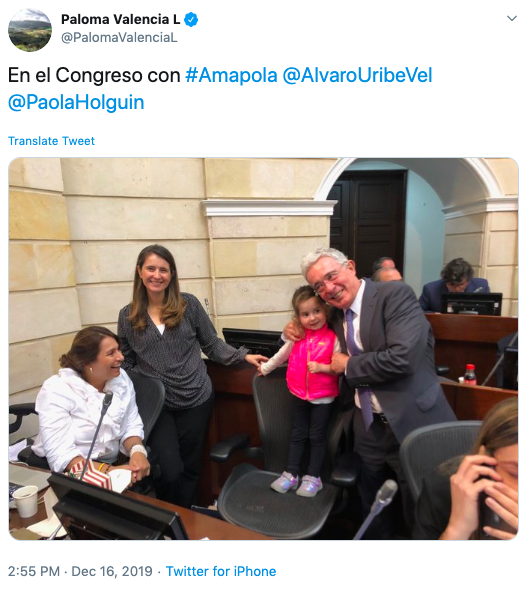 The daughter of Ignacio, and last scion of this great family, is Paloma Valencia, who suggested to divide the Cauca into two, campaigned against the peace process and who tweets pictures with her daughter Amapola and the president of the para-state, Alvaro Uribe (12)