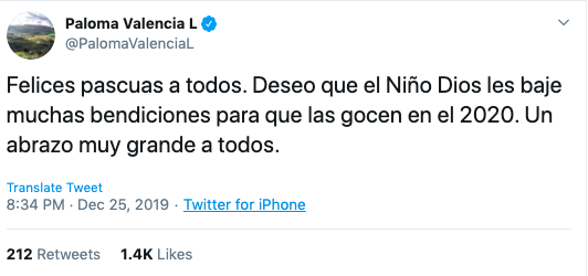The great senator, Paloma Valencia, has studied creative writing in New York and on this basis she has the gift to write the perfect tweet, such as this one, in which she wishes Happy Easter to everyone – on Christmas Day (13)