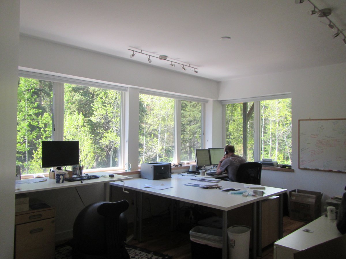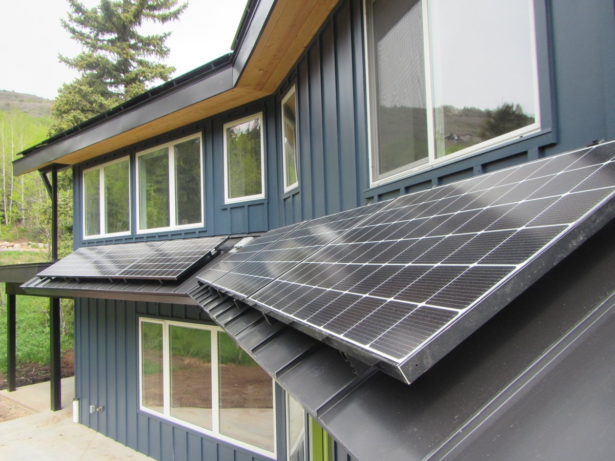 Most windows face south. Roof overhangs block the summer sun angle and allow winter sun, for maximum solar gain in the winter. The awning roof is used for additional solar panels.