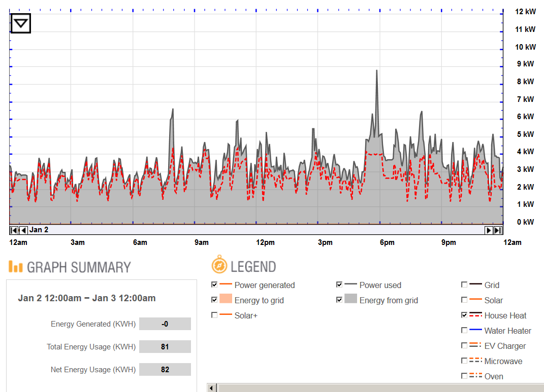 The eGauge monitors our electrical usage. CTs are on relevant lines in the electrical panel. It’s continuously monitoring: total usage, generation, heat, EV, and water heater. We move CTs around to see the other circuits. The graph is from the day that the low was -9F.