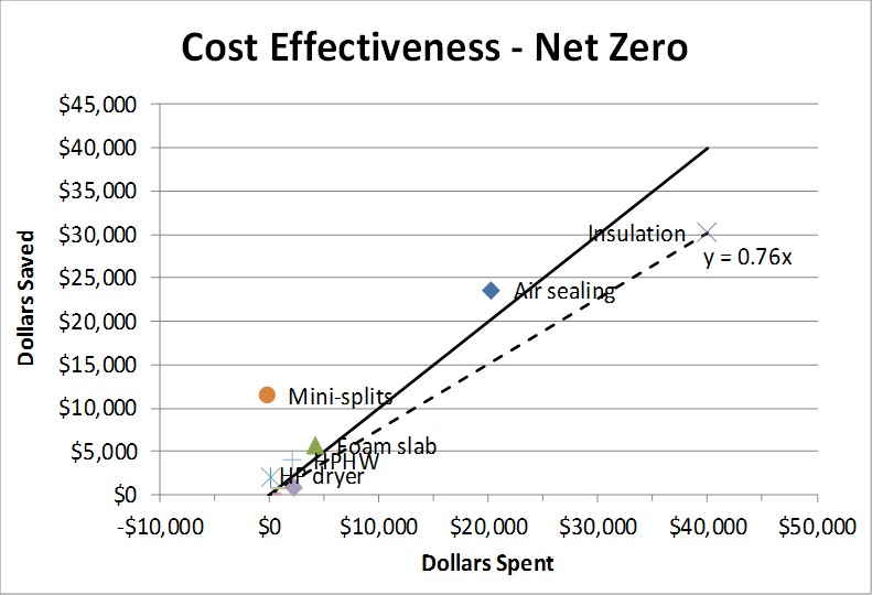 Financial considerations: We added $88,000 to the construction costs for: additional framing, air sealing, insulation, windows, HVAC systems and HRV, and solar panels - minus avoided cost of gas line and heat tape.