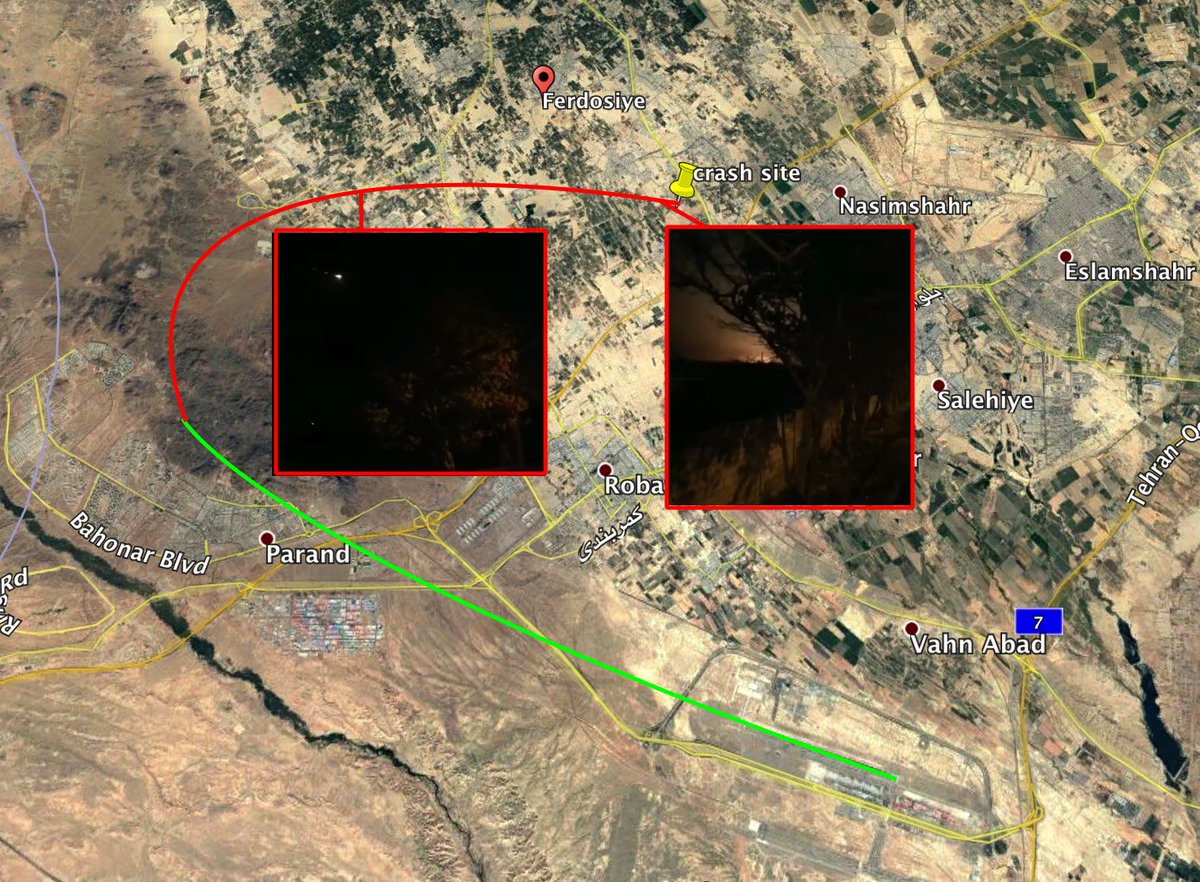 The Boeing traveled more than 20 kilometres after @flightradar24 lost its track over Parand and crashed in the town of Khalaj Abad.