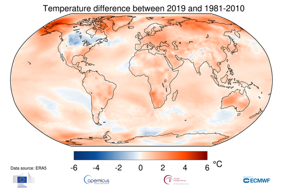 The 2010-2019 decade is the warmest on record with the last five years at between 1.1-1.2°C above pre-Industrial levels. Data: cds.climate.copernicus.eu/#!/home.