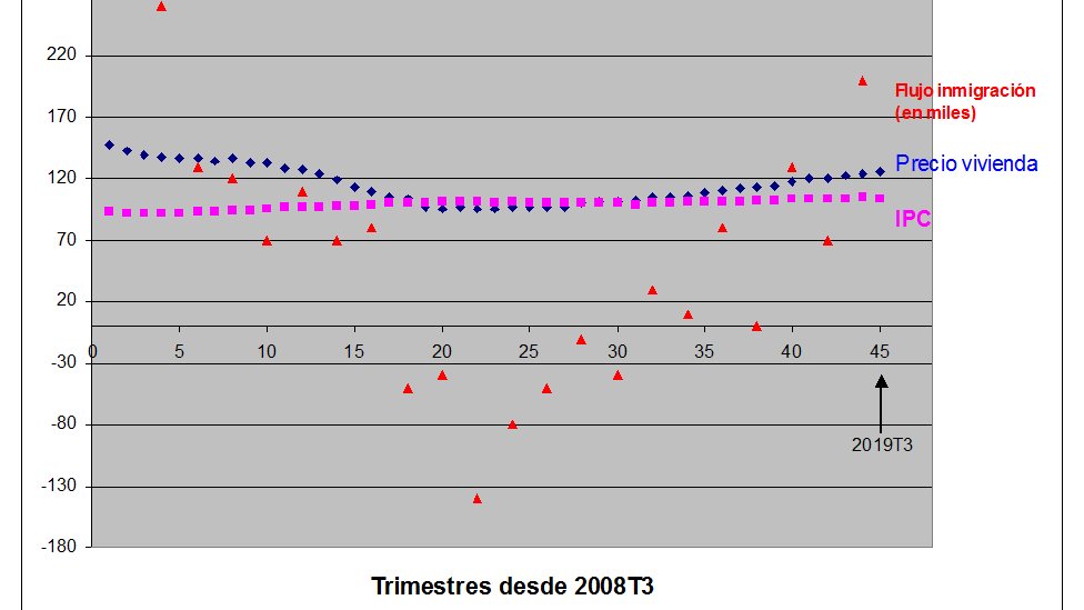 3/? Para mayor claridad, en este otro gráfico pongo la lupa exclusivamente en la variación del precio de la vivienda (con base 100 en el 2T de 2015) versus el flujo de inmigrantes (en miles). Se puede cuestionar la relación causa-efecto, pero la asociación es llamativa.
