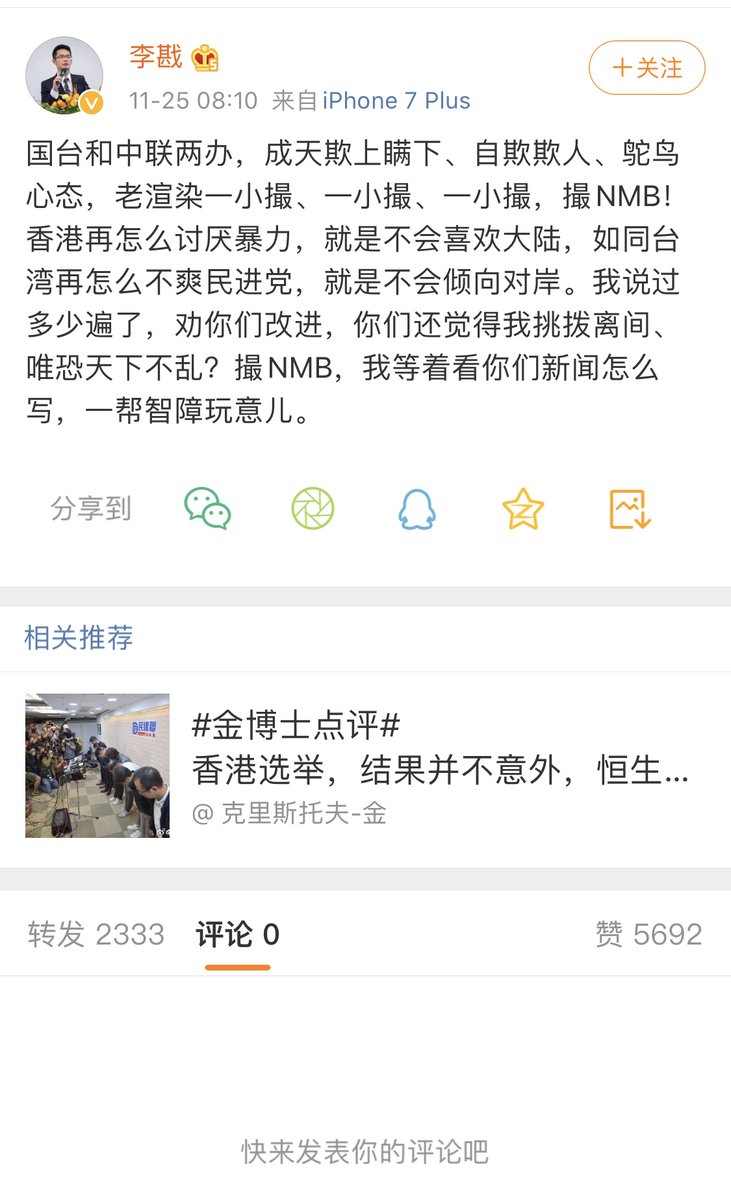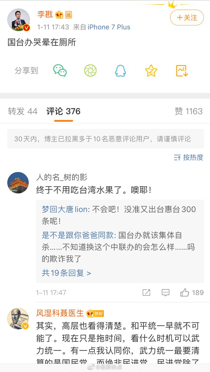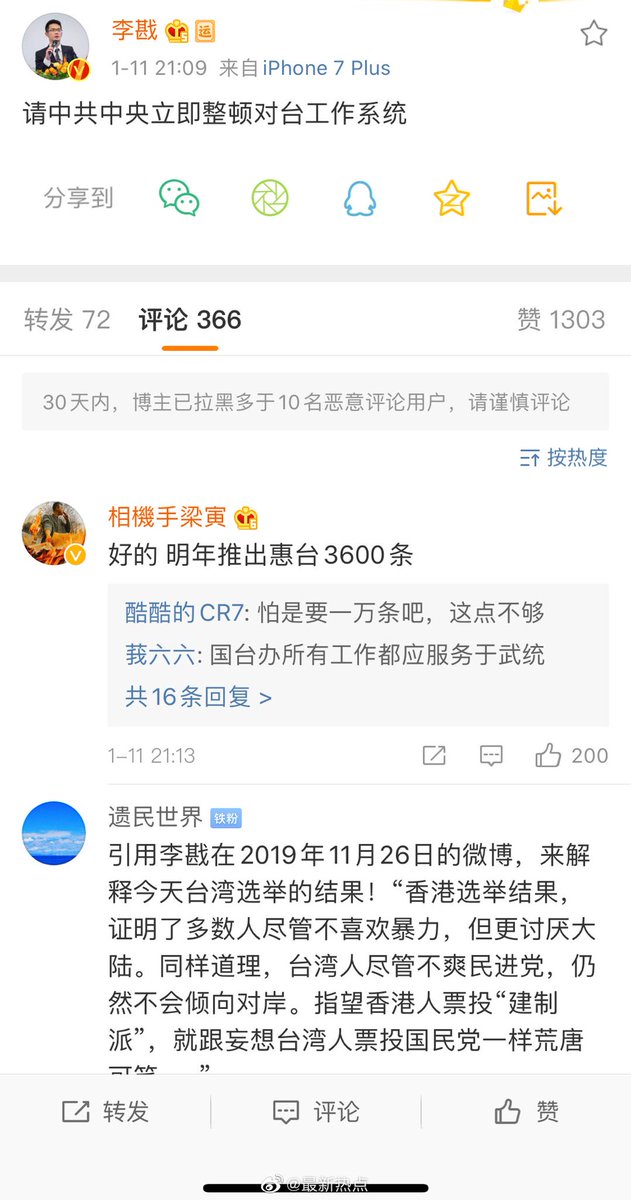 李敖之子李戡在11日晚间台湾总统大选结果出来后,发多条微博嘲讽国台办。后经其本人在Facebook确认已被永久封号。继承李敖衣钵的李戡,是在墙国网络上十分活跃支持统一分子,也因其过往尖锐言论遭来争议。