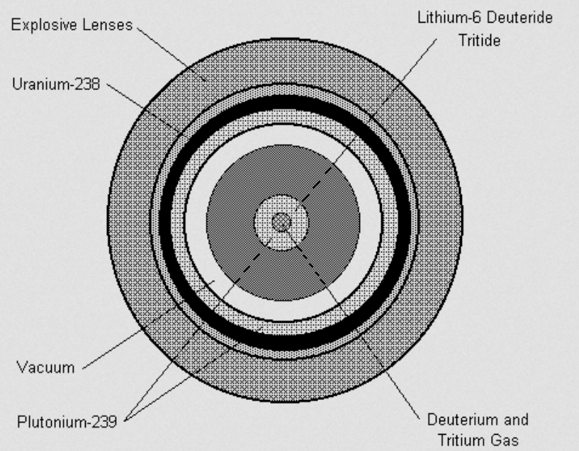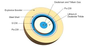 11/ در این روش تمام ساختار تا حد زیادی شبیه به بمبهای متعارف شکافتی است،اما در این بمبها ناخالصی دوتریوم و تریتیوم به بمب شکافتی اضافه میشود. در این فرآیند ابتدا انفجار معمولی رخ میدهد که پوسته بیرونی با سرعت چند کیلومتر در ثانیه به سمت داخل حرکت میکندو فشاری در حد چند بار