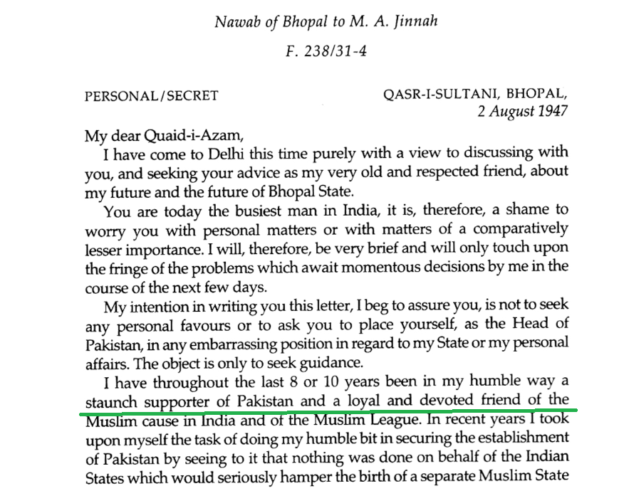 Is that why his family, which ruled Bhopal, begged Jinnah to include their entire kingdom in Pakistan in 1947 ?