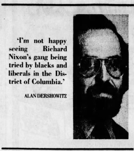 "I'm not happy seeing Richard Nixon's gang being tried by blacks and liberals in the District of Columbia". @AlanDersh, associate of Jeffrey Epstein, who will defend @realDonaldTrump in the impeachment trial Tuesday.
