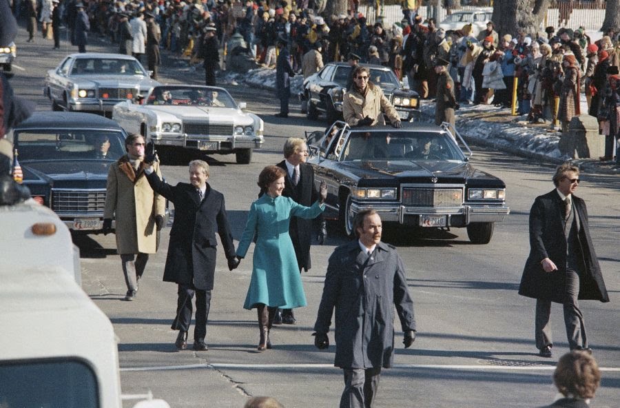 This Day, 1977: After a decade dominated by Vietnam and Watergate, Jimmy Carter promised a new era of openness and honesty in the White House. Here: He and Rosalynn after departing the Capitol