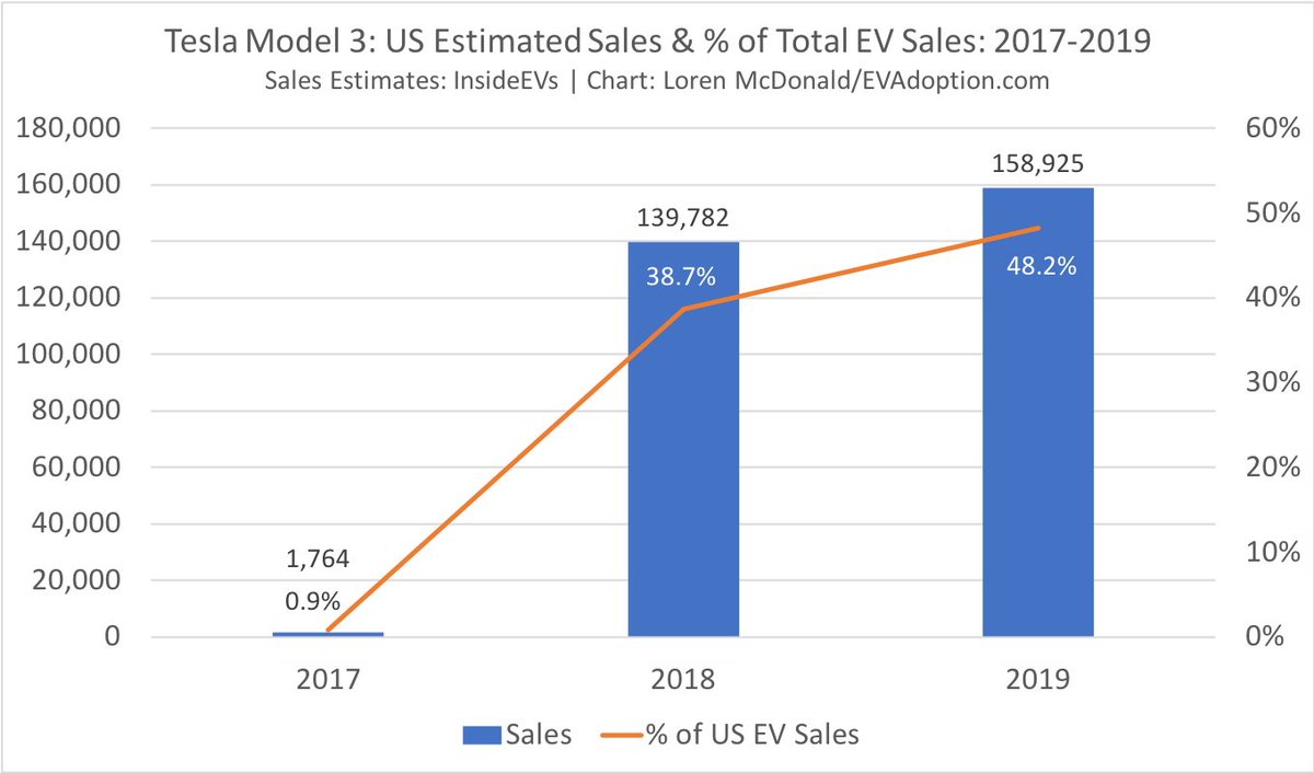 - InsideEVs’ 2019 estimates = 48.2% of all US EV sales