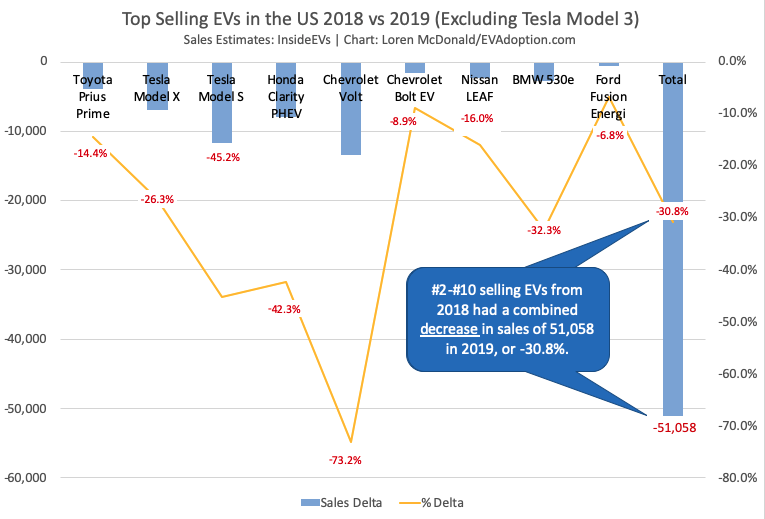 - But 31% decline among the other top 10 selling EVs available in 2018 + 2019