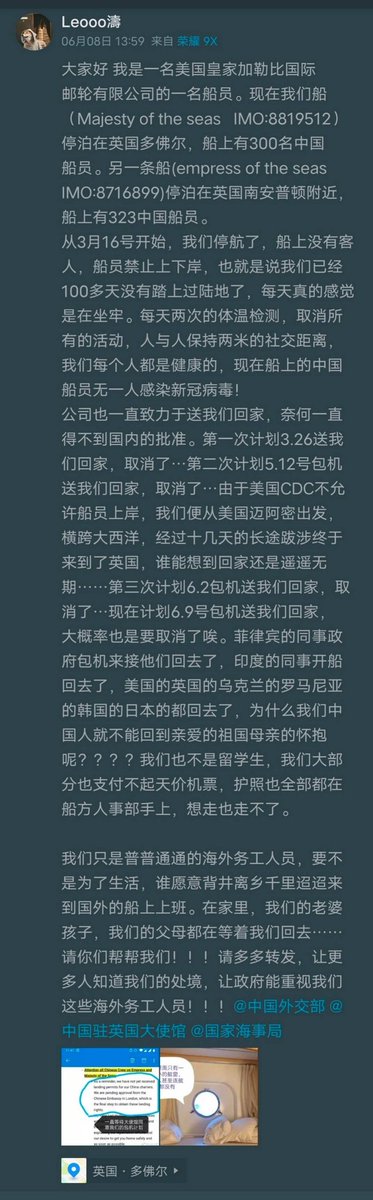 当事人微博发帖求助(现已被删除),超600名游轮的中国雇员因疫情被困海上,已漂流多国多日。现在位于英国某港口,多次回国计划不被国内批准。