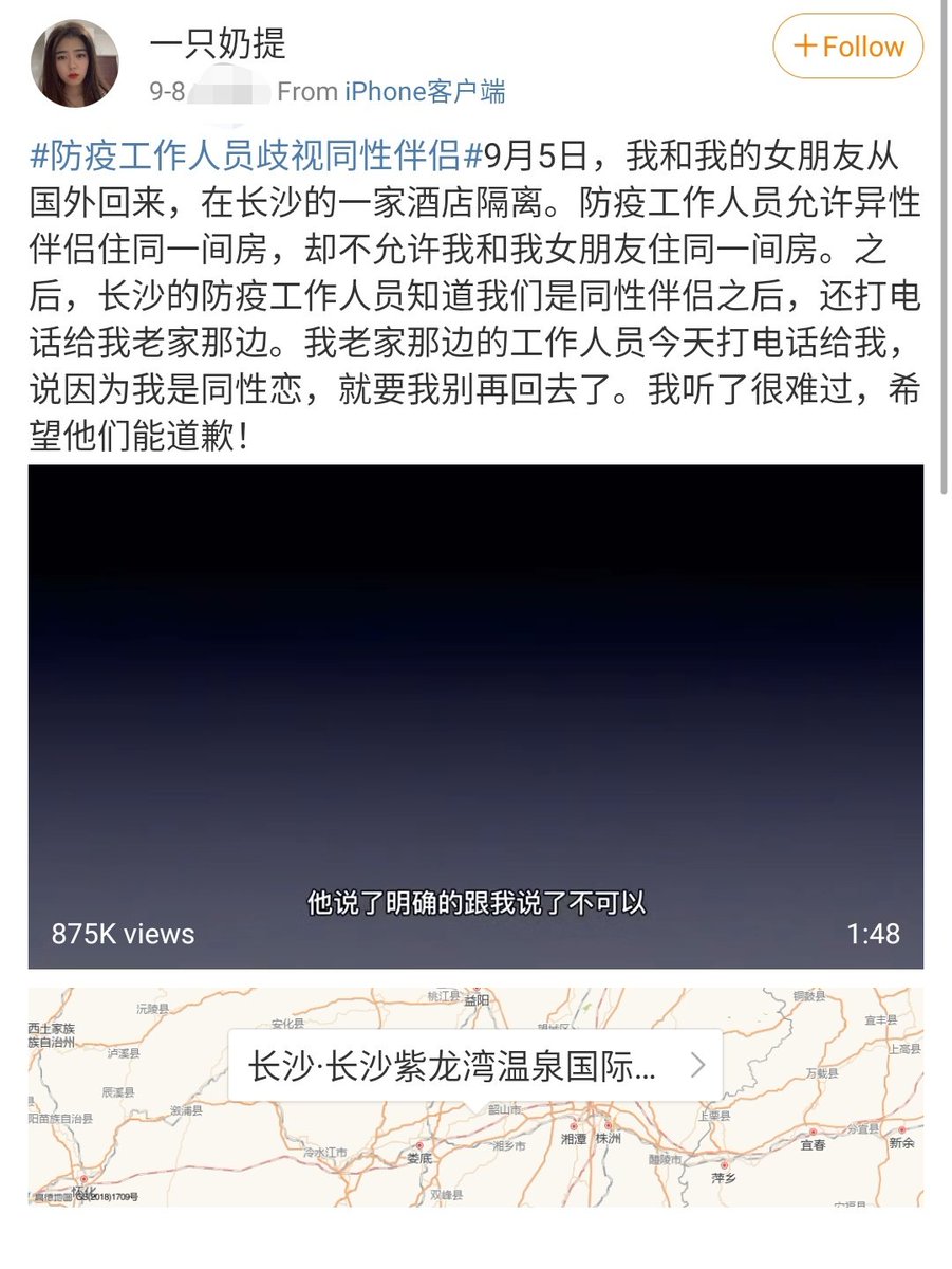 归国在酒店隔离的“一只奶提” 希望与同性恋人同住一间房间。工作人员拒绝后又称其身为同性恋有悖常理并不欢迎回到当地。